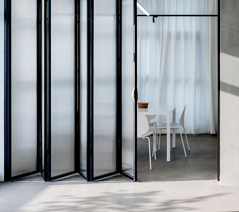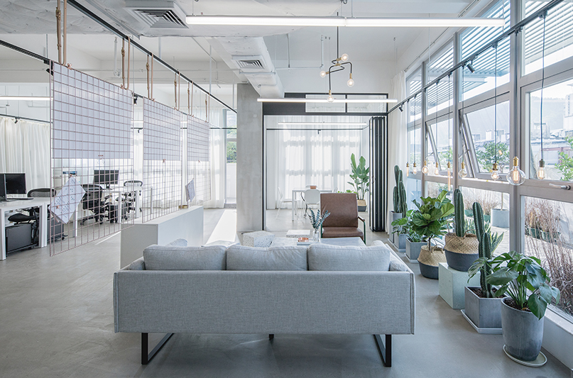 沿側(cè)壁的辦公室裝修中采用白色漆金屬架可用于儲(chǔ)存、展示模型以及放置花盆。在地面以上2.5米處,幾組黑色涂漆金屬框架相互連接形成“回路”,可用于懸掛釘板、安裝懸垂軌道和軌道照明。