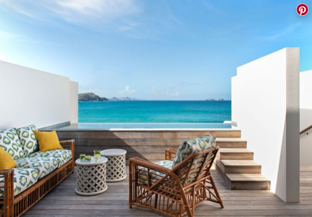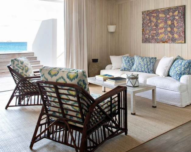 建筑師Kirscher設(shè)計(jì)的新海灘套房提供帶私人游泳池的田園風(fēng)格露臺(tái)。沙發(fā)和藤椅(serena&Lily)覆蓋著ikat面料(IDO擴(kuò)散)??繅|(設(shè)計(jì)師協(xié)會(huì))。